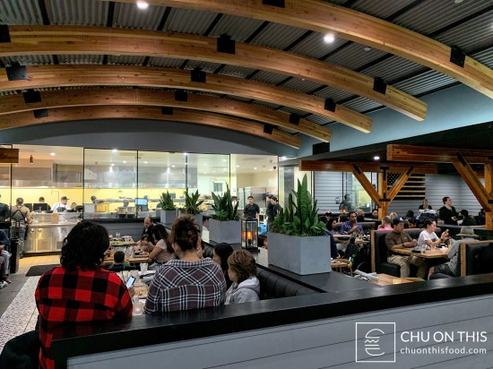 The restaurant itself is located on the perimeter of the mall building itself, not necessarily a standalone place. When we first walked in, I was impressed with how it almost felt like the interior of a barn, kind of like that Americana feel. There was decorative siding on the walls, wooden support beams, along with a nice blend between light gray and black paint scheme to contrast with the wood textures. I also liked how it was an open kitchen at the back, with glass dividers that still let you see inside it. At the front, there was also a racetrack-style bar along with an outdoor patio seating area as well.