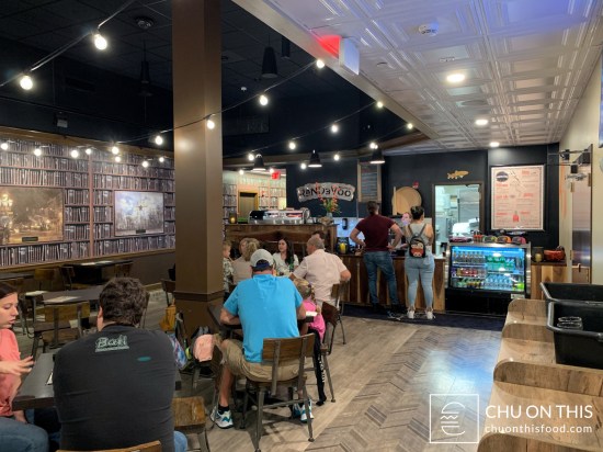 The space itself was pretty brightly lit, with a number of tables that could accommodate probably around 40 people or so. In keeping with the book shop theme, one of the walls common to the space had a faux bookshelf print to it. The restaurant doesn’t offer any true table-side service, as you order your food up at the counter and bring a number to your table. For drinks, you can order them at the bar from Lost Tavern or pick up waters from the dispenser they had next to the bar.