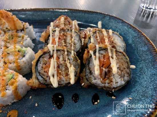 King salmon and lump crab on the inside, deep-fried, topped with lemon aioli, sweet soy sauce, and Old Bay seasoning (pictured without cream cheese).