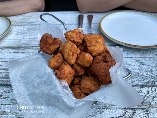 We went through the tray of oysters pretty quick, and it was great timing since the chicken bites came out next. Bite-sized chunks of chicken breast meat that were breaded in a flour mixture and then fried, the appetizer did have a good number of pieces, served in a mini fryer basket. While the chicken itself was juicy, I did unfortunately find that the flour breading wasn’t really seasoned too well, so the bites lacked flavor. In addition, I think that they were left in the fryer a bit too long, since I got a bit of a burnt taste on some of the pieces where the breading was a bit darker.