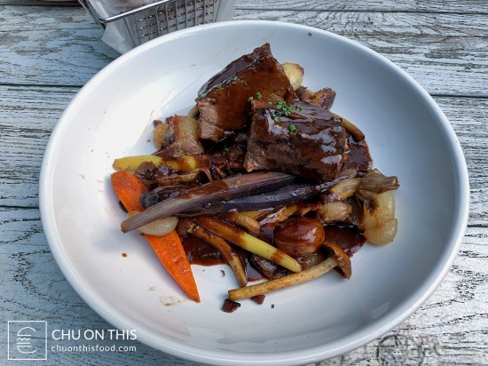 Braised short rib with a red wine sauce and bacon, served atop a vegetable medley of carrots, pearl onions, and mushrooms.