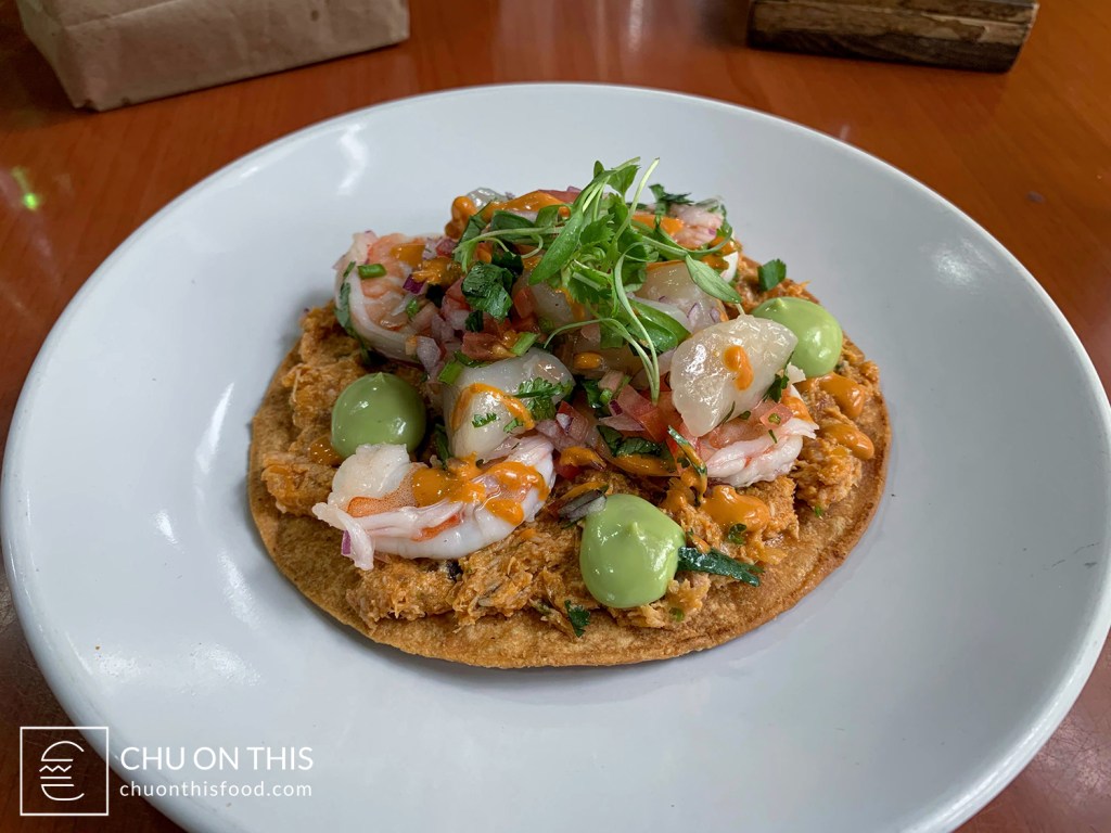 Along with the tacos themselves, our tostada was equally as visually stunning. There was definitely a meticulous arrangement of the ingredients on top of the smoked kanpachi. We broke into the tostada first and managed to arrange a bite that included all of the major components. The smoked flavor from the kanpachi was probably the first thing that was very evident, but then you got notes from the scallops and shrimp after that. The peanut sauce drizzle, along with the avocado crema, added some nice flavor notes that complemented all of the seafood really well. The crunch from the tostada also helped provide a nice texture contrast as well.
