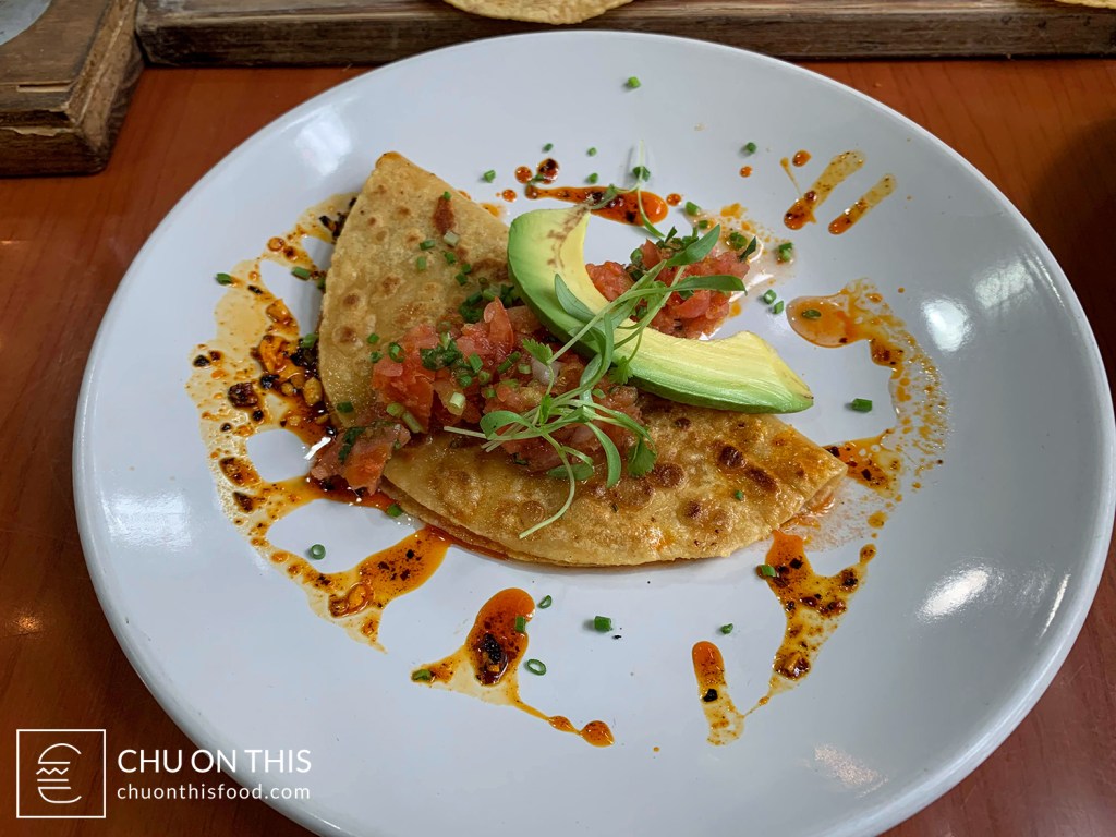 - Smoked Kanpachi Taco — this one felt a little more like a mini quesadilla than a taco. There was a really nice smoky flavor from the fish, with melted queso chihuahua mixed into the middle. It was topped with some salsa cruda, avocado, and some microgreens, while the peanut salsa macha helped give a nice, subtle kick to some bites.