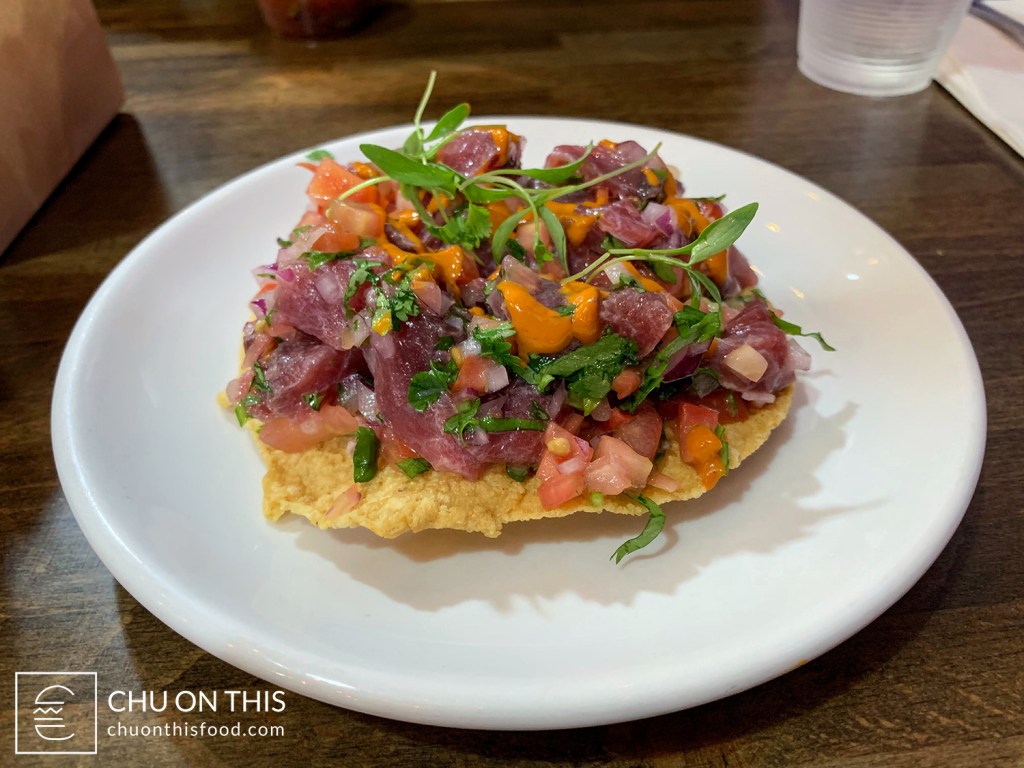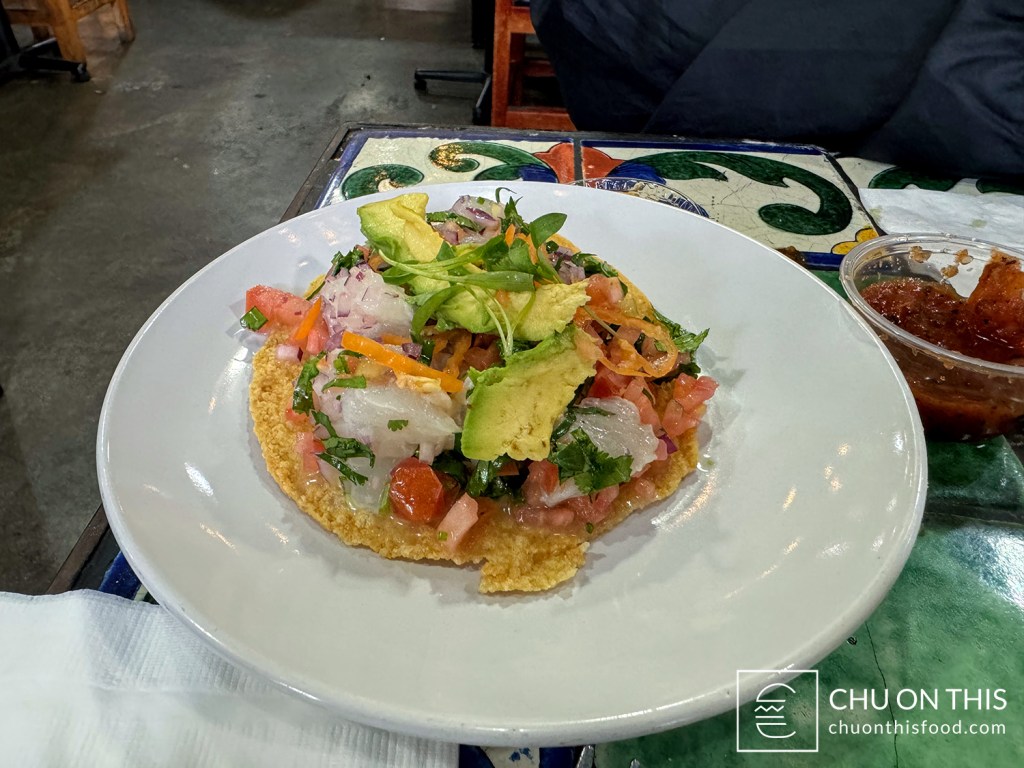 Because of the marketplace environment, there wasn’t necessarily specific seating designated for Holbox. We took a number to set down at an open table that we found nearby; that was how the staff knew where to bring out the food to. I’m not sure if it’s because we were one of their first customers of the day, or if it’s because they’re typically really efficient, but it seemed like we weren’t waiting too long at all for our food. A complimentary chips and salsa came out to our table first, followed by the tostada a little after that, and then our full spread of tacos. All in all, that was probably no more than a 10 minute span for all of our food to arrive.
