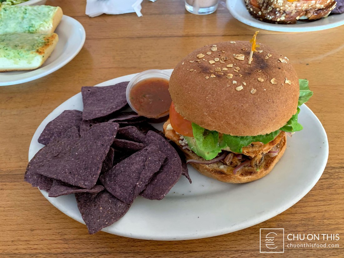 Grilled chicken breast, avocado slices, grilled red onions, lettuce, and tomatoes, with added feta cheese. Served on a whole wheat bun, along with blue corn tortilla chips and salsa.