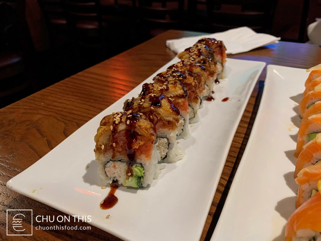 The Sunset Roll was doubling down on the salmon, with the ingredient contained both inside as well as outside. The salmon was complemented by thin-sliced lemons and ponzu on the outside, coupled with salmon, avocado, and jalapeño slices on the inside. You definitely got the strong salmon flavor, with some heat from the jalapeño slice, along with the tartness that came from the lemon. With the Hunt Roll, each piece was definitely a large bite. Spicy tuna and eel tempura on top, with cucumber, avocado, and crabmeat on the inside, finished with some eel sauce and sesame seeds. The tempura texture contrasts with the softness of all the other ingredients, but I liked the savory flavors from an overall perspective.