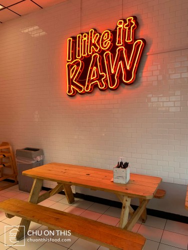 The seating situation was pretty straightforward: a bunch of picnic benches put inside the dining area. Not to mention the neon “I LIKE IT RAW” sign that gave off the orange hue to the general area.