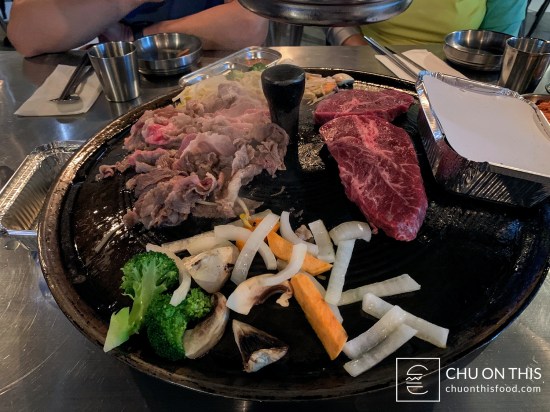 We ended up sticking primarily with beef and pork for the meat selections, but we did want to diversify the flavors of the options. All in all, we ended up getting the thin-sliced beef brisket, flat iron steak, Berkshire pork belly, marinated pork short rib, and marinated thin-sliced beef ribeye. In addition to the assortment of banchan, we also decided to go with an order of the spicy tofu soup as well.