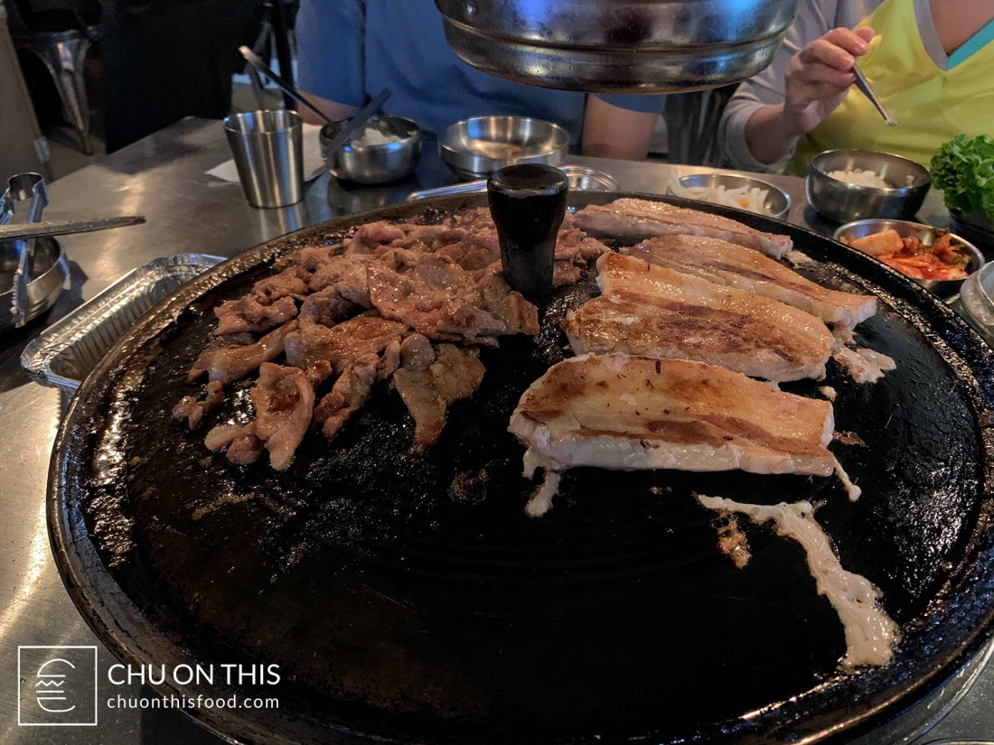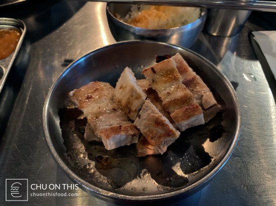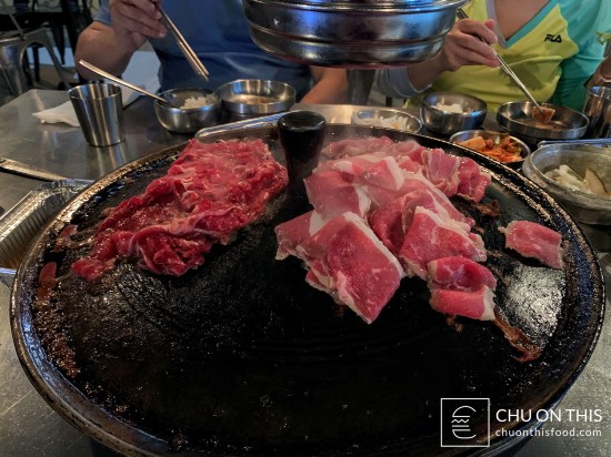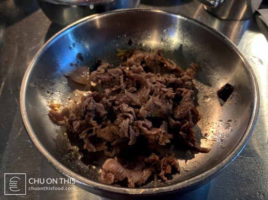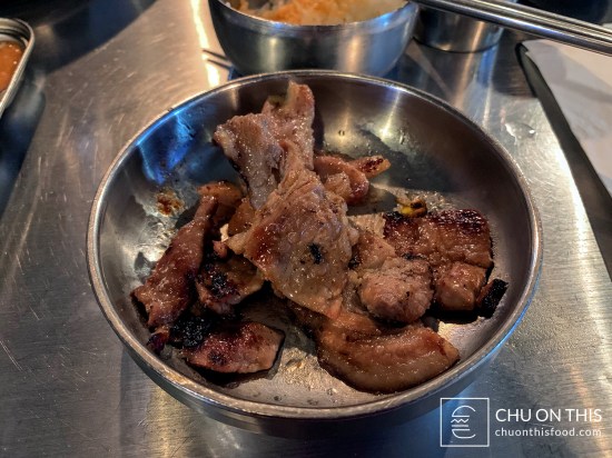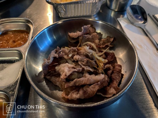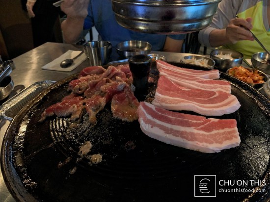 At this particular KBBQ spot, the waitstaff help cook the food for you, as opposed to you cooking it yourself. To a certain extent, I think this helps provide the restaurant with two benefits: 1) it ensures you’re not going to eat undercooked food on accident, and 2) it helps them pace out your meal to ensure you aren’t dragging out the time so they can get other people seated. I think I’ve been noticing this more lately at KBBQ spots I’ve been going to, unless it’s just chance that I’ve been going to these types of places as opposed to ones where you can cook for yourself.