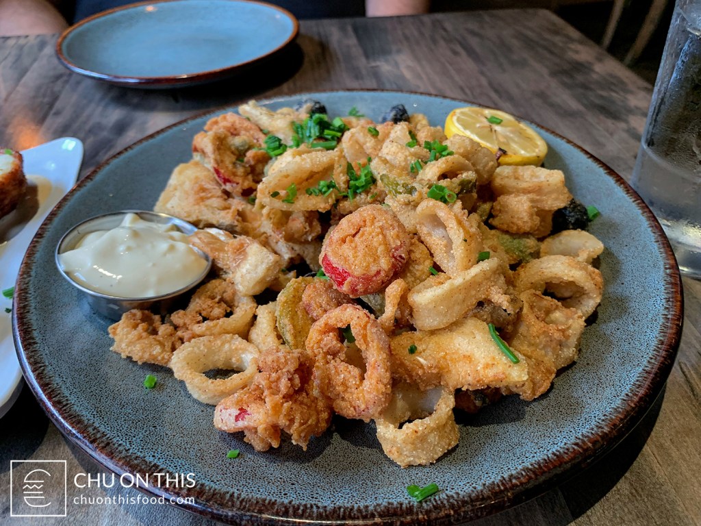 Squid, artichoke hearts, cherry peppers, and olives tossed with Semolina flour and fried. Served with charred lemon aioli.