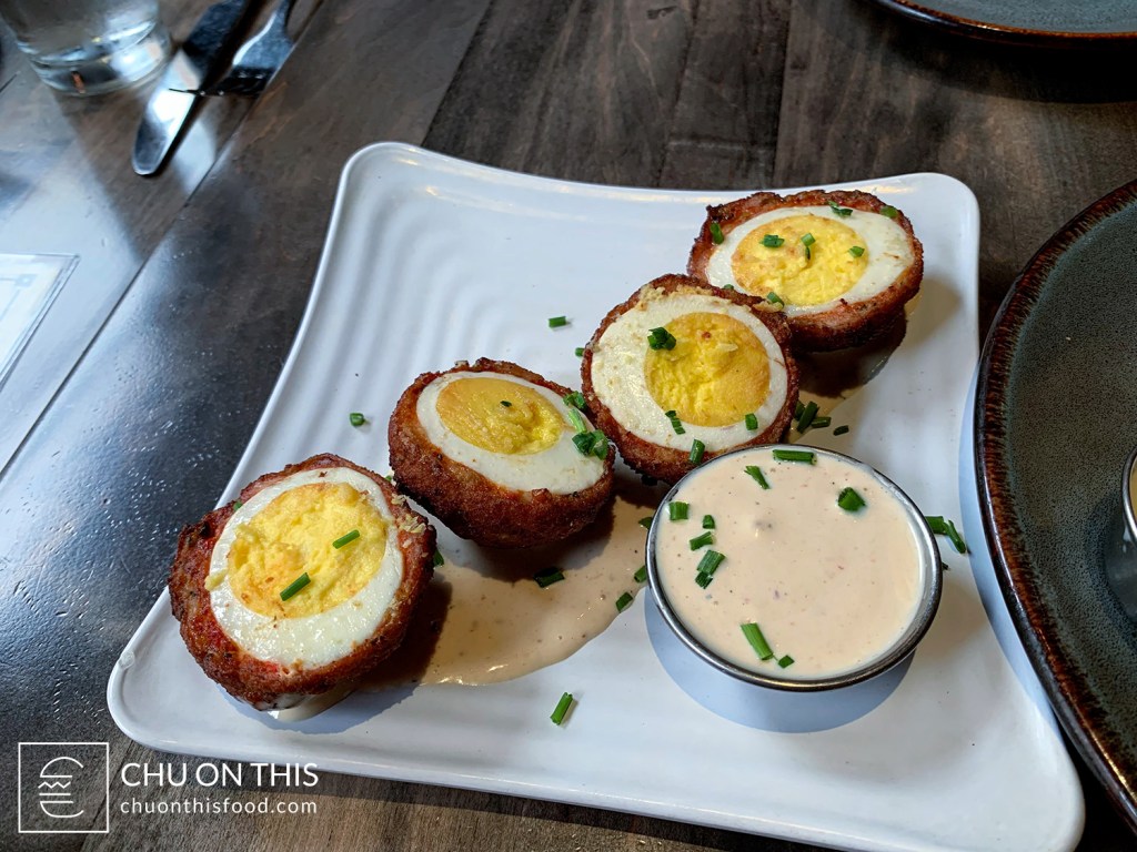 Our calamari and Scotch egg appetizers arrived out of the kitchen, and they definitely looked like they were going to be good. Then it was time to see if the taste was going to back it up. I started with the calamari first, which also had a mixture of artichoke hearts, cherry peppers, and olives, in addition to the squid. Using the Semolina flour for the breading definitely provided more texture, kind of reminiscent of cornmeal. I thought that the crispiness of the calamari and other vegetables was done really well, and the charred lemon aioli complemented each piece, especially with the squeeze of the fresh lemon juice on top of the entire plate.
