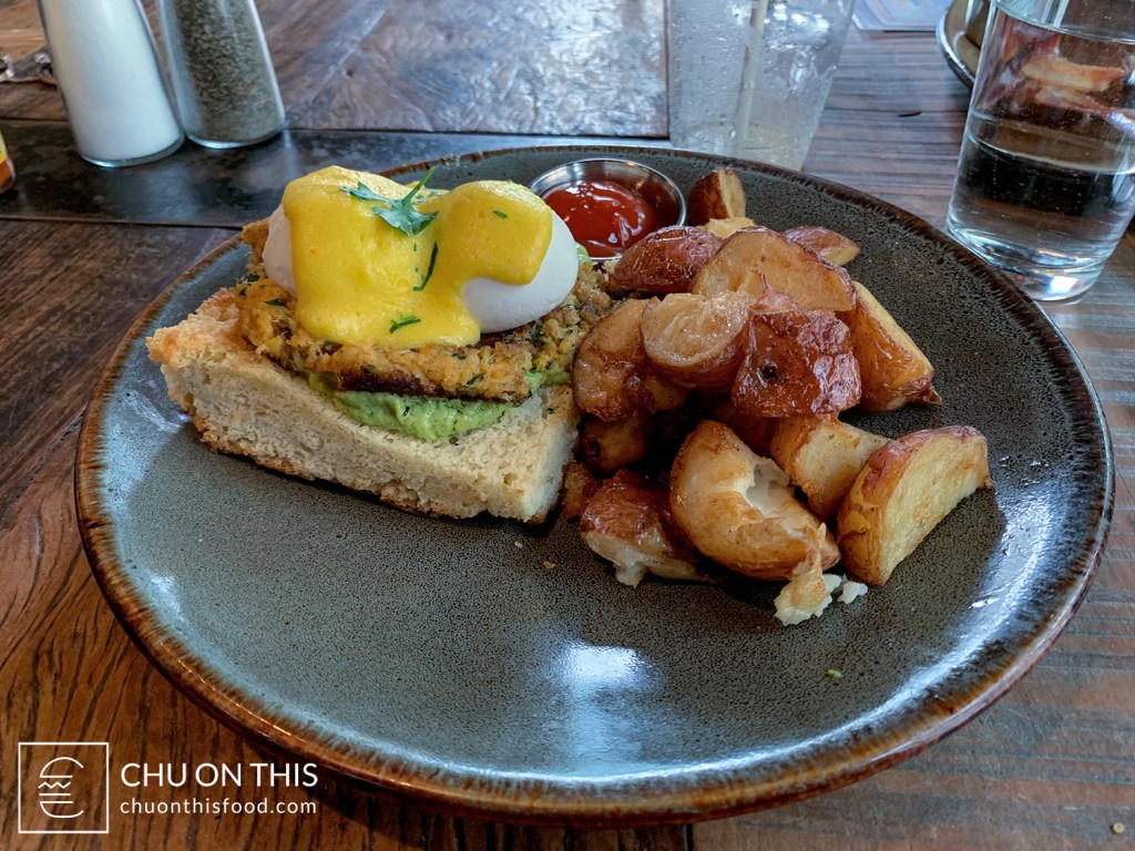 Old Bay seasoned blue crab cake with poached eggs, avocado spread, and hollandaise sauce. Served with home fries.