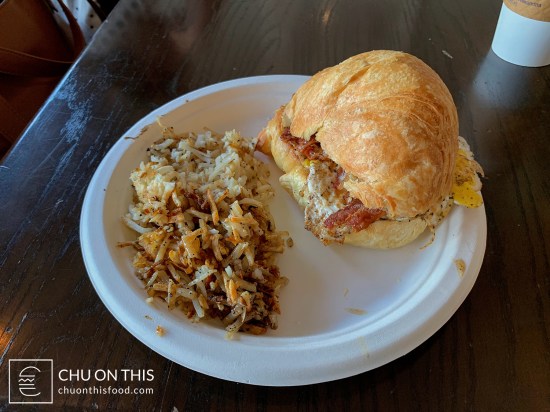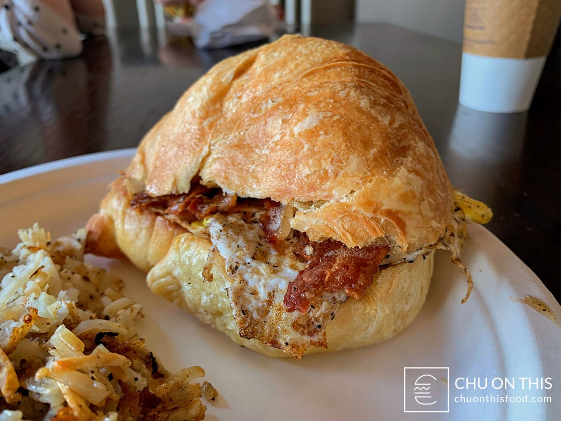 The full menu of offerings is posted up on the wall when you first walk in, with the counter to order off to the right, along with the griddle, coffee machines, and pastry displays. The breakfast options are relatively straightforward, with choices from sandwiches, wraps, or pastries. One of the breakfast sandwiches caught my eye above the rest: The Princess, notably for the fact that it had the most interesting sounding combination. Two fried eggs, bacon, and Dijon mustard, served on a baked croissant definitely piqued my interest; considering it was listed as one of their specialty sandwiches, I was trusting that it must be good. I’m a pretty big fan of potatoes during sit-down breakfast as well, so I tacked on a side portion of hash browns for my order.