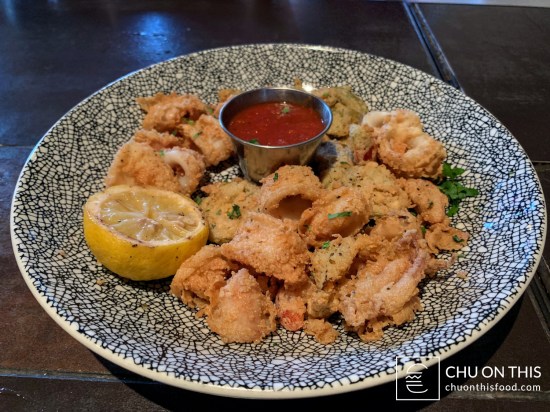Even though the wood-fired pizzas were one of their specialties, their menu also featured a number of other Italian pastas and entrées, along with salads, soups, and a burger option as well. There was a lot that sounded good, with Mark and I both going back and forth on which pizzas we wanted to split. He was really feeling the Mushroom (béchamel, wood roasted wild mushrooms, mozzarella, and truffle oil), with a half-half split to substitute out for feta cheese for me. My eyes were drawn to the Diavola (spicy sopressata salami, topped with fried kale and Calabrian chili hot honey), also with a substitute for feta. Of course, when I saw calamari on the appetizers list, I had to make the suggestion for us to split that as well.
