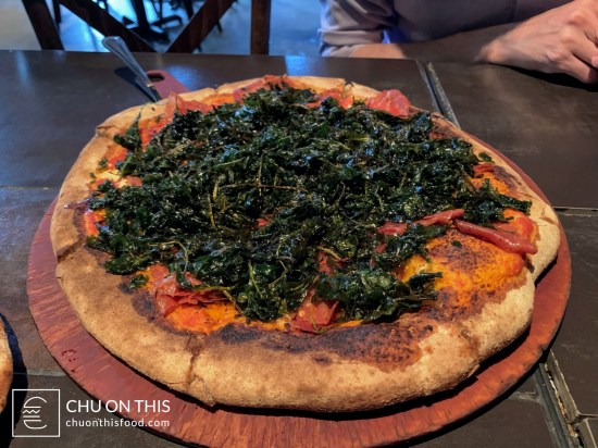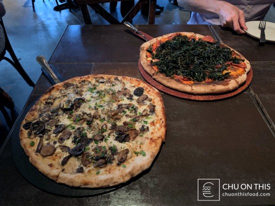 Both pizzas came out to us piping hot, and they both looked and smelled amazing. We went in for the Diavola first, which was piled high with the fried kale on top. I wasn’t expecting it to be that much kale, and it definitely made for interesting bites trying to make sure none of it fell off. (I can say that I wasn’t very successful at that.) The spicy salami combined well with the spicy red sauce to give things a kick, and then the hot honey also added that sweet heat element to things as well. The ingredient listing on the menu got me curious, and I’m glad that the combination ended up working out.