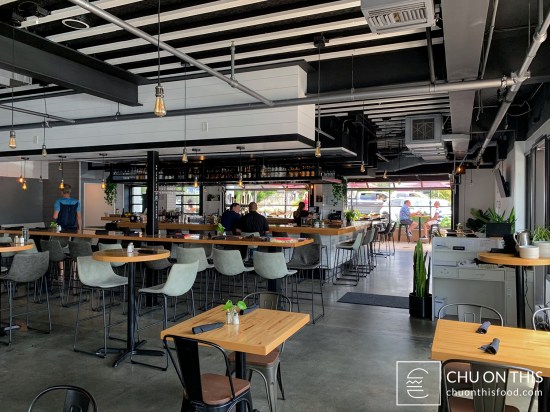 Located in a shopping center that contained an assortment of other types of businesses, Solana Beach Kitchen occupied a relatively large dining space on the first floor of one of the buildings. I really liked the open air concept of the dining area, with garage doors that opened to the outdoor patio and helped provide a lot of fresh air coming inside. The overall color scheme centered around the neutral colors of black / white / gray, with the wooden tabletops providing a nice visual contrast when you looked across the dining area.