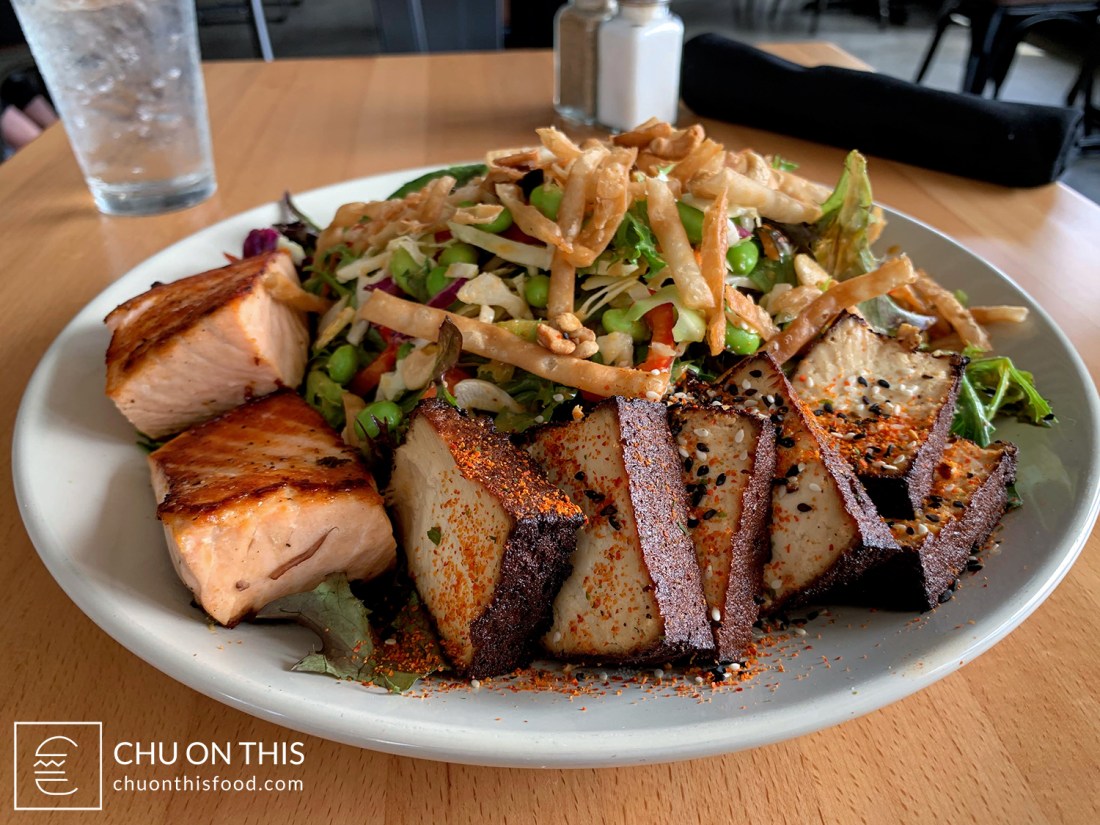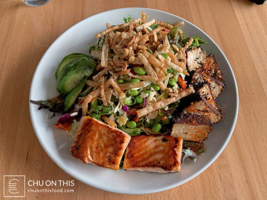 Presentation-wise, this salad aced the test. Bright, vibrant colors amongst all of the different components that made up the salad. The aroma from the grilled salmon was inviting, with the sear marks looking really spot-on for the two pieces. The slices of tofu looked like they had crisp edges around them, while still maintaining a softer texture in the middle. Since the tofu was the star of the salad, I started by taking a bite, and it had those textures that I was thinking. There was also a really nice soy and sesame flavor to the tofu itself, likely soaking in from the marinade they used.