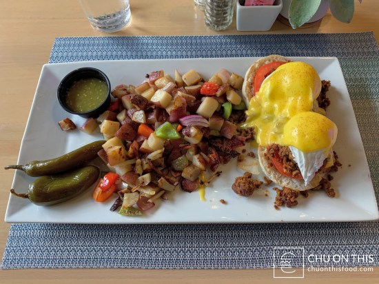 It was probably another 10 – 15 minutes before my Spicy Chorizo Benedict came out of the kitchen. There was definitely a generous portion of country potatoes that came with the benedict plate, with the two English muffins on one side, stacked up with sliced tomatoes, chorizo, poached eggs, and Hollandaise sauce. Two pickled jalapeños and salsa verde completed out the rest of the plate of food.