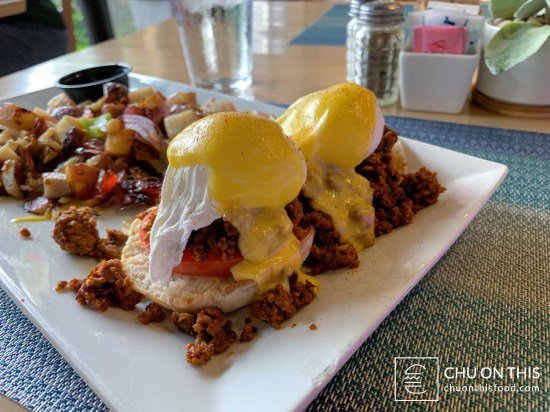 Their breakfast menu consists of a number of different options including omelettes, eggs benedicts, skillets, along with griddle options like pancakes, waffles, and French toast. I was still on my eggs benedict kick, so that made it pretty easy to narrow down the choices. There was a Spicy Chorizo Benedict that did sound like it’d be pretty interesting, so that’s what I ended up going with.