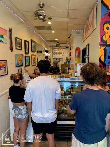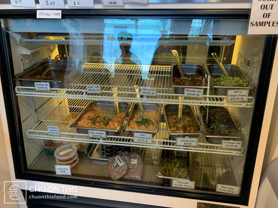 Their primary poke options revolved around either salmon or ahi tuna, with also tako (octopus) and crawfish on the menu as well. They also had ahi handrolls, inari handrolls topped with spicy tuna, and also some pork or chicken plates from the kitchen. But the line out the door was definitely for the poke, so that’s what I was going to stick with.