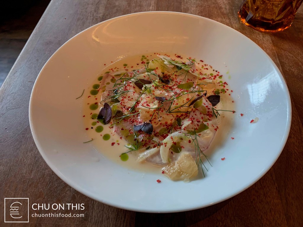 There were a number of other options that I was looking through on either their small plates or shareables section that sounded pretty good, including the hanger steak, turmeric spiced naan, and marinated tomatoes. But it was Tony who drew my attention to the seared diver scallops, saying that it was his favorite dish on the menu. After looking through the description and spotting “bourbon glazed pork belly,” I saw all I needed to be convinced. I decided to go with another seafood pairing with the scallops, opting for the Hawaiian Kampachi crudo.