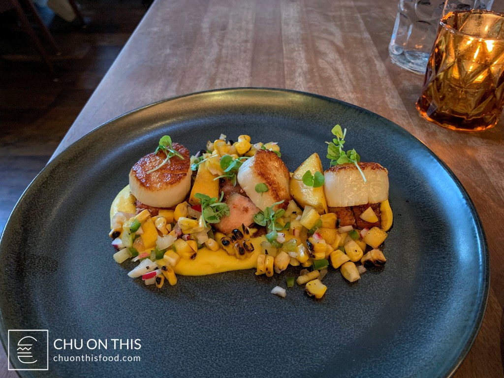 Pan-seared diver scallops with bourbon glazed pork belly, placed on a bed of sweet corn puree, topped with pickled green tomato succotash and grilled market peaches.