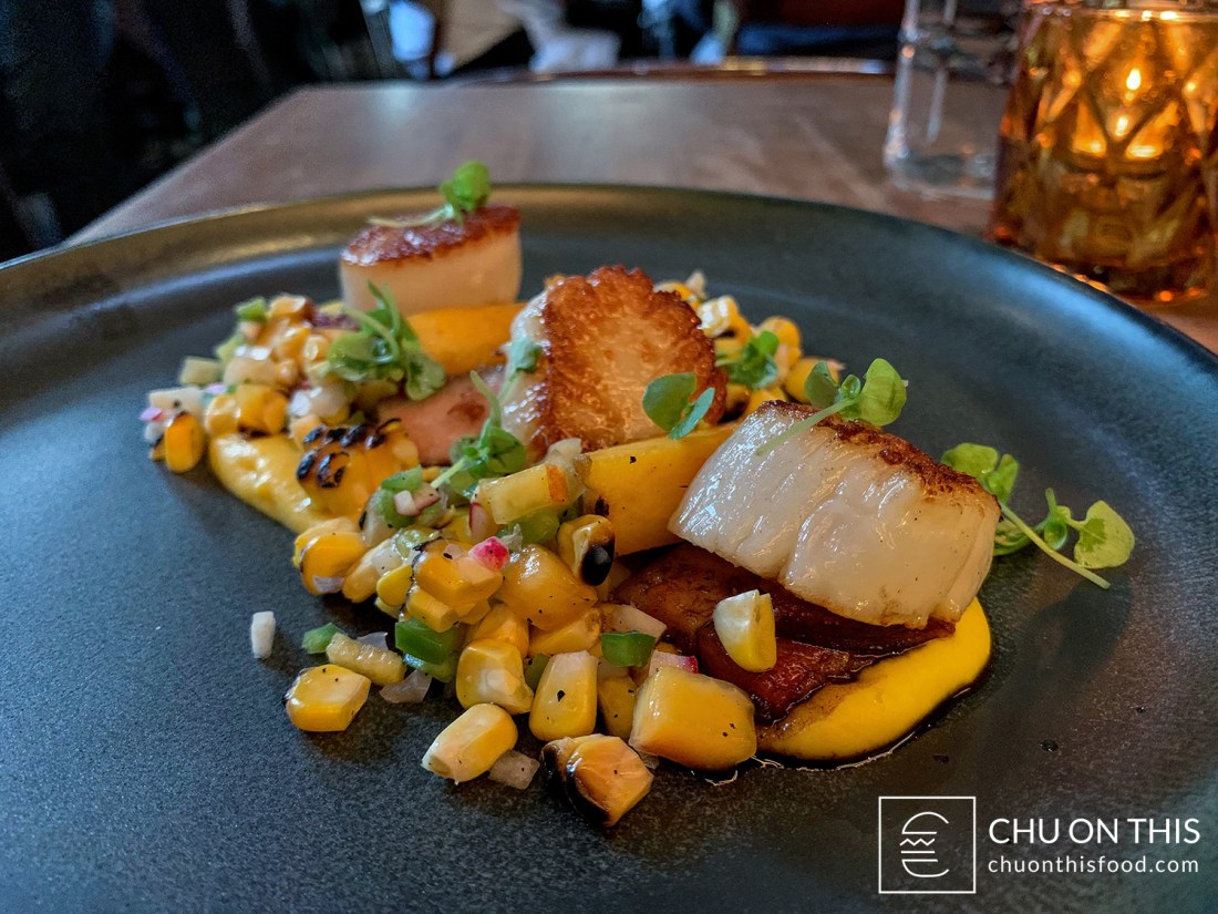 It was the scallops, however, that really stole the show for me. Three diver scallops, seared on both sides, were placed on top of pieces of bourbon glazed pork belly, all resting on a bed of sweet corn puree. A pickled green tomato succotash was added on top, along with some grilled peach slices as well that served to provide a barrier between each scallop. Savory, sweet, smoky, and umami were all of the primary flavors that encompassed this dish, especially if you were able to construct a well-rounded bite with all of the ingredients.