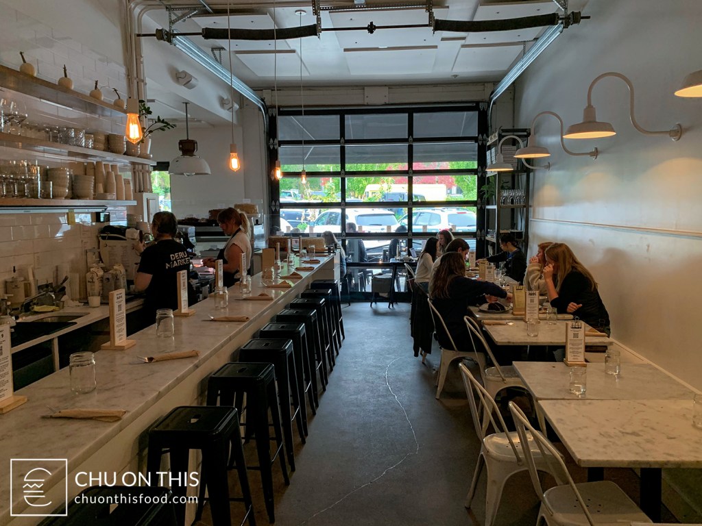 The restaurant itself has a blend of seating options between both indoor and outdoor. For the start of a Thursday lunch service, the inside was relatively full when we arrived, so we opted to sit outside instead. It seems like the space might have been formerly another auto body shop, since there was a large garage door that had gotten converted into one with windows to allow natural light inside. The other décor featured a blend of industrial and modern, with metal for the dining furniture and light fixtures coupled with the marble tops of the dining tables and bar seating.