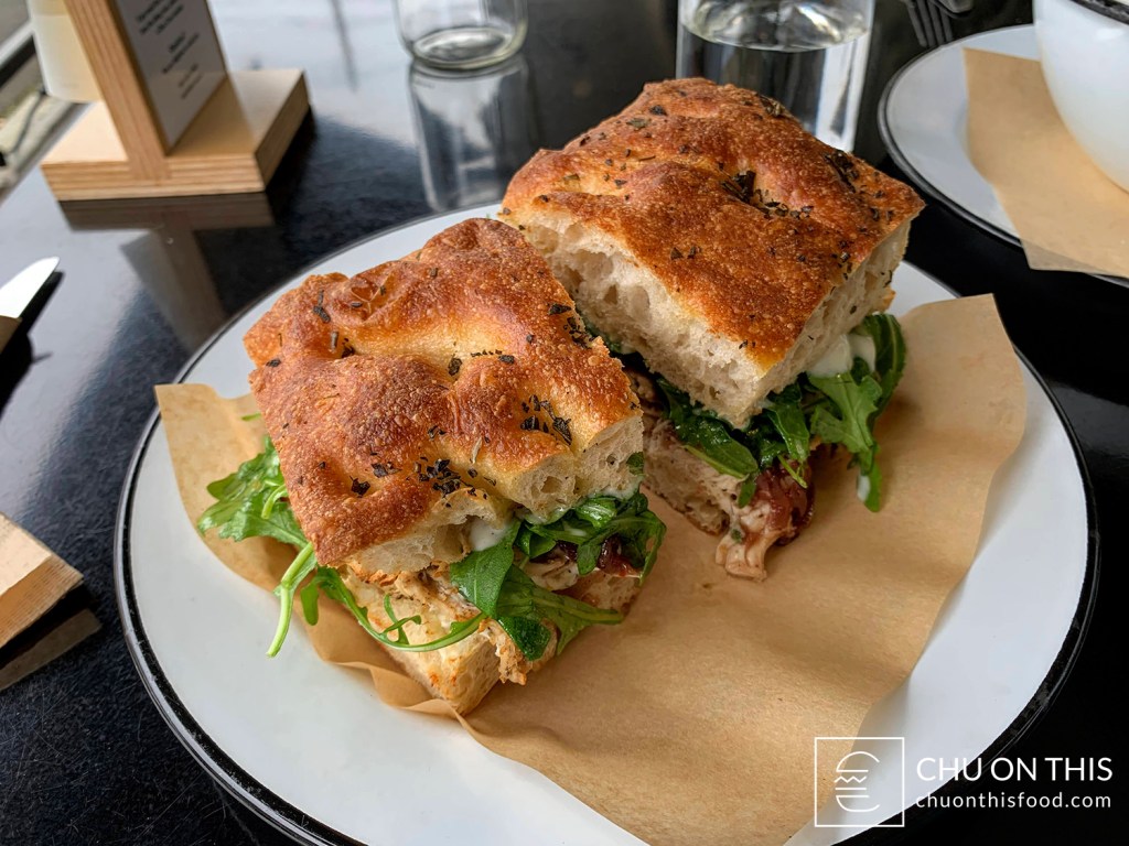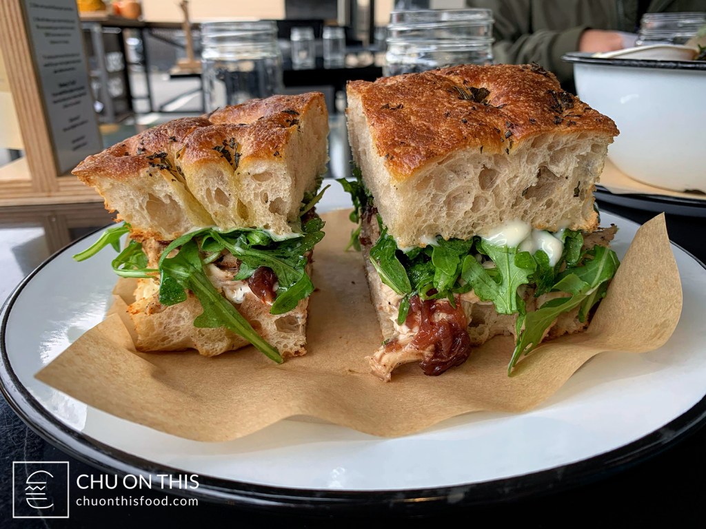 “Wow.” That was honestly my reaction as my roasted chicken & goat cheese sandwich got placed down in front of me. Roasted chicken in a herb marinade, goat cheese spread, house-made onion marmalade, arugula, and house-made herb aioli, sandwiched between two thick slices of house-made herb focaccia. The color contrast between the different layers of the ingredients stood out and the smell really was fantastic.