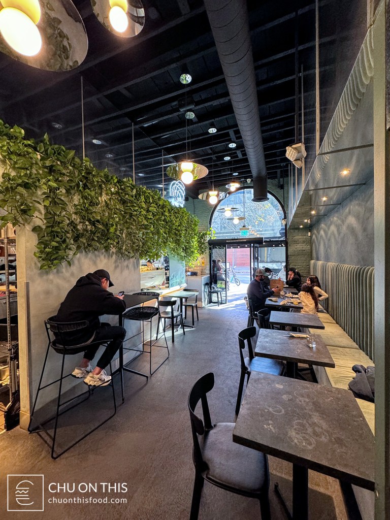 The restaurant certainly leaned in to the gray color palette, with that driving the accents of the walls, tables, and plateware. The greenery overhanging from the walls of the kitchen / barista area was definitely a nice touch of color to brighten the interior.