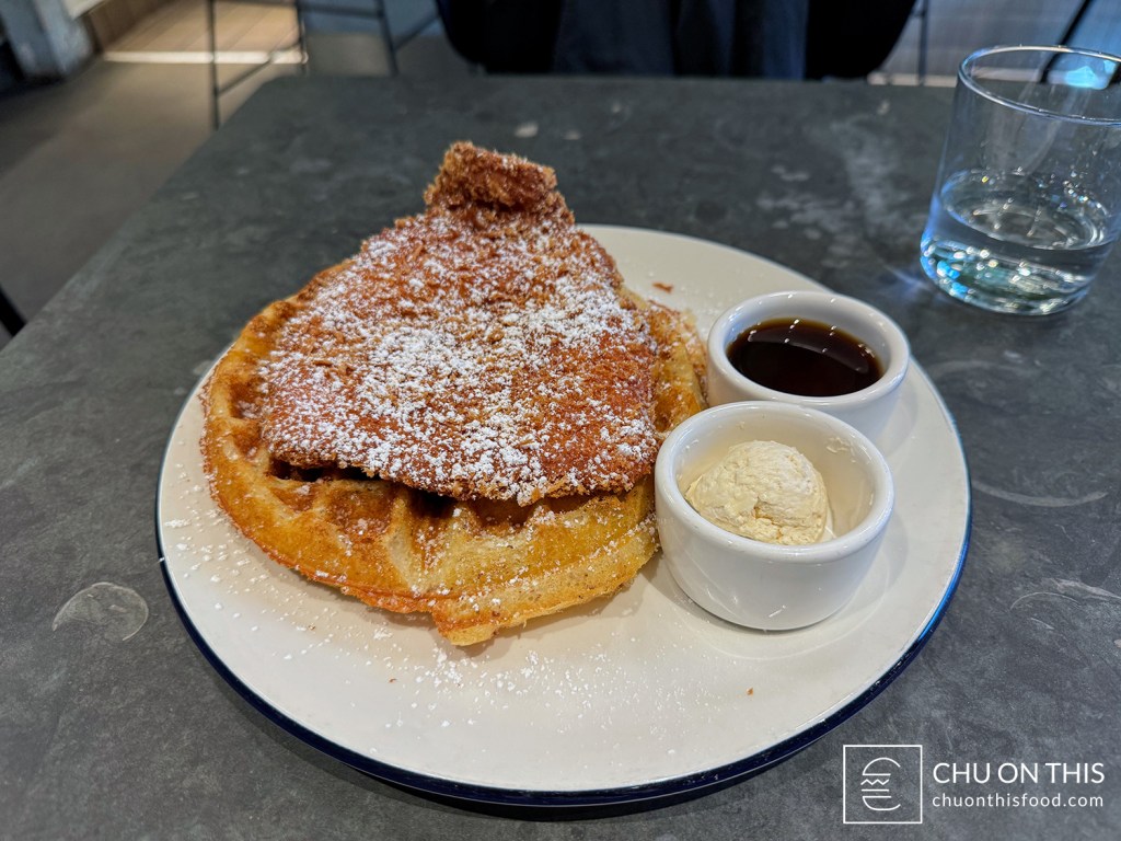 Panko-breaded chicken katsu with almond flour waffle. Served with maple syrup and honey butter.