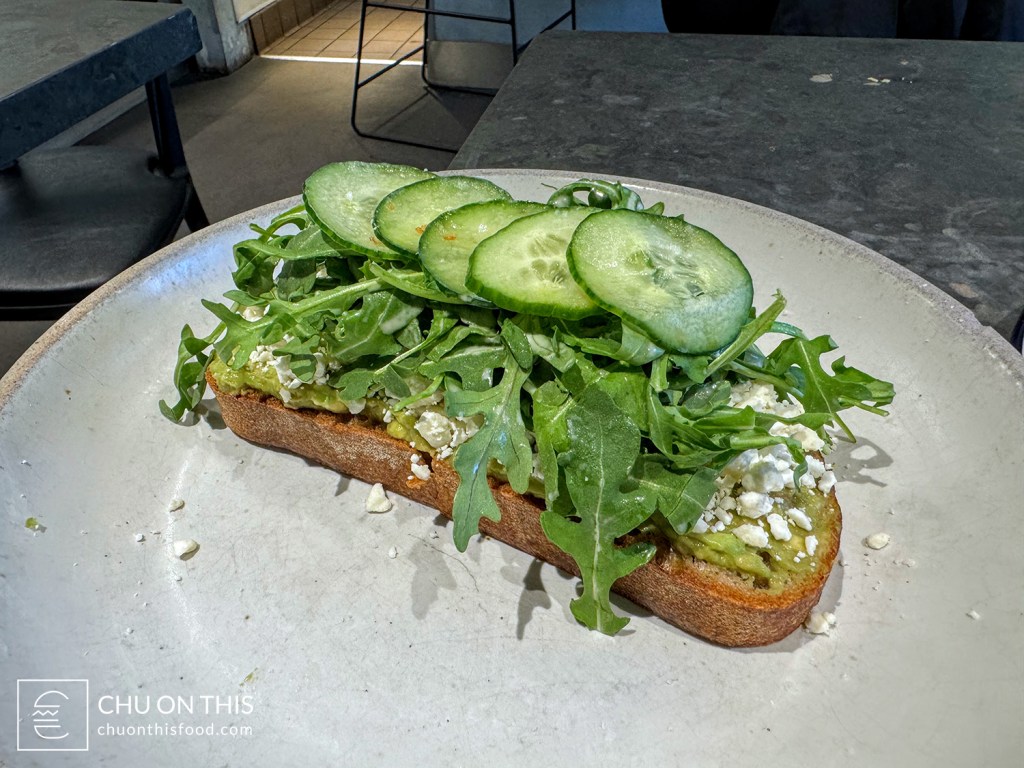The other half of my order, the avocado toast, arrived probably a couple of minutes after I started to dig into my chicken & waffle. The bright green was certainly a color contrast from the other dish, and I liked how the restaurant’s plateware was gray, which helped the colors of both dishes pop off the plates. The avocado toast was also topped with a bed of arugula tossed with a citrus honey vinaigrette and sliced cucumbers. Typically, the dish also calls for burrata, but I substituted that out for feta cheese instead. All of this was stacked up high on a thick piece of sourdough.