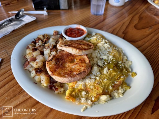 To our surprise, the kitchen was able to crank out all of our food in no time. In total, we had five plates of food to come out, and it was ready in about 10 minutes. At first when our waiter was coming over to our table with food, I was thinking that he was delivering it to the wrong table. Nope, that was our order all right. The omelettes were definitely hefty portions, with half of the plate taken up by the omelette and the other half with the homestyle potatoes. Add in the buttered and toasted English muffin and some salsa, and that was definitely a plate of food that would keep me full for quite some time.