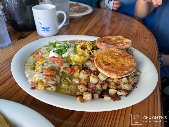 Carnitas, green chiles, avocado, red onions, and tomatoes, topped with homemade salsa verde, Monterey Jack cheese, sour cream, and chives. Served with homestyle potatoes and English muffin.