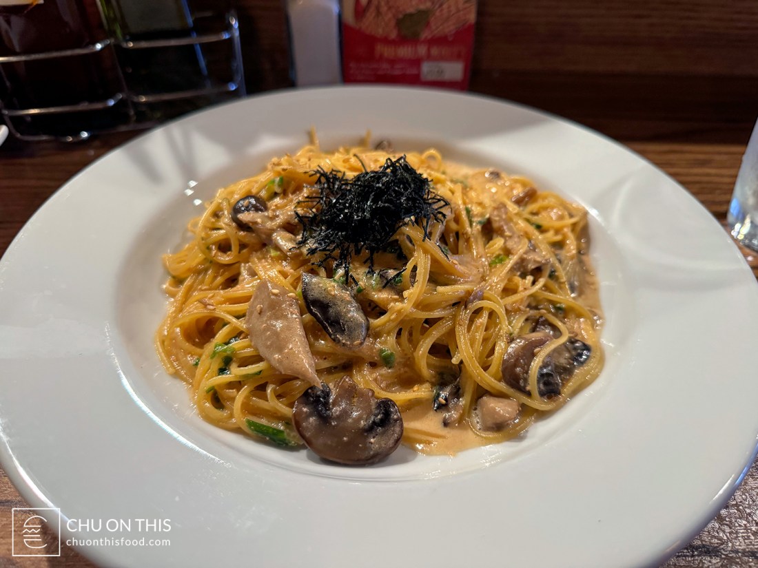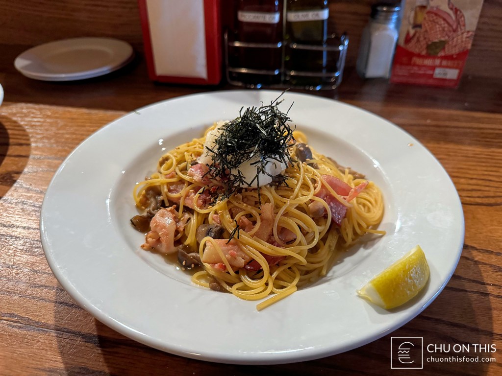 Japanese style cream sauce with cod roe, mushrooms, and scallions. Topped with shredded seaweed.