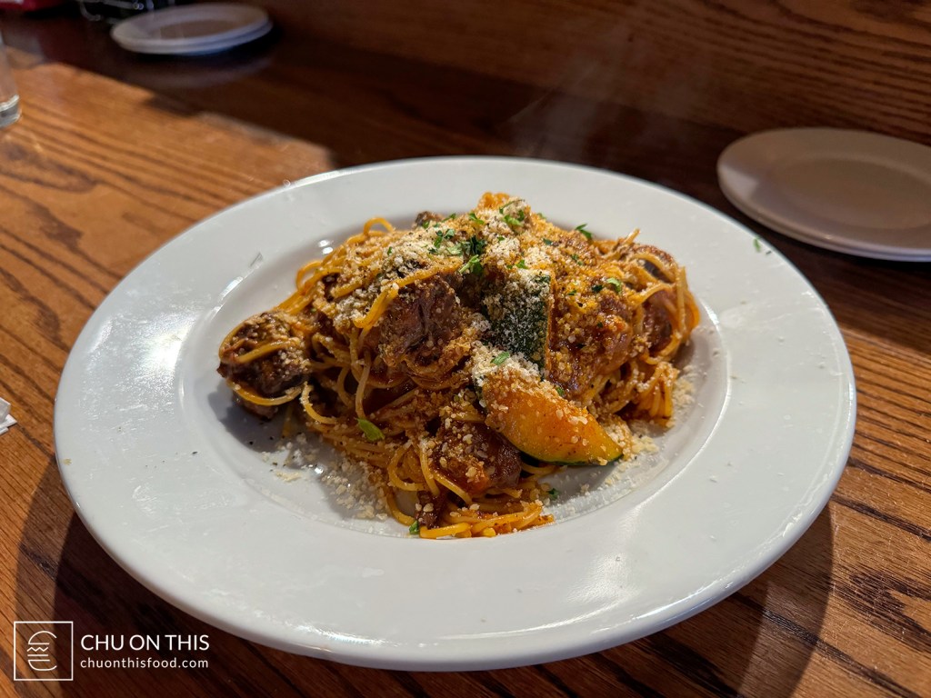 All of the pasta dishes came with a portion of house salad, along with bread and butter. The house salad came with a nice Italian vinaigrette, and was a good way to start things off before we dove into the heaviness of all the pasta. If you’ve read any of my other reviews, you know how I always enjoy having a good view of the kitchen, so our seating was perfect for that. It was crazy to see the pans on the stovetop burners just be a continuous rotation of all of the different pasta dishes, keeping up with the 50 or 60 people all seated in the restaurant. It wasn’t before long that our pasta dishes came out to us, arriving two at a time.