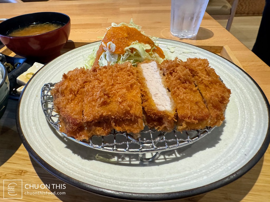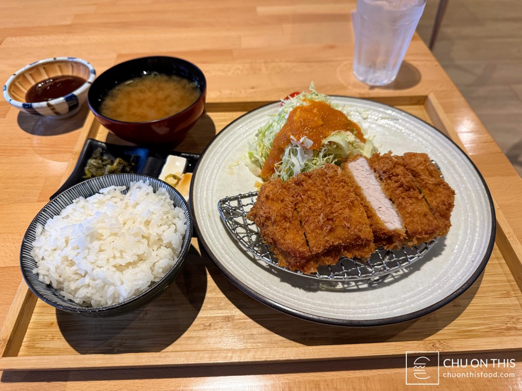 Pork loin katsu, served with shredded cabbage and miso dressing, miso soup, rice, pickled vegetables, chilled tofu, and katsu sauce.