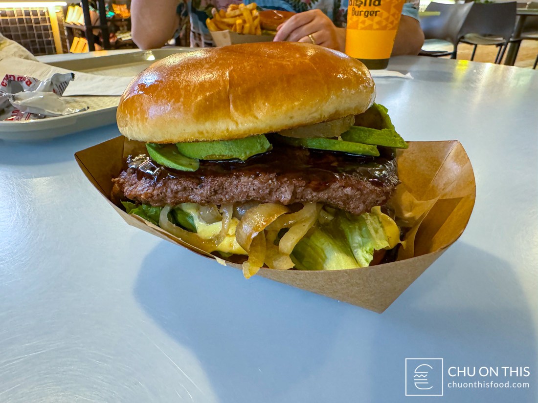 1/3 lb. ground beef patty, served with lettuce, caramelized onions, mayo, teriyaki sauce, and grilled pineapple. Pictured with avocado slices.